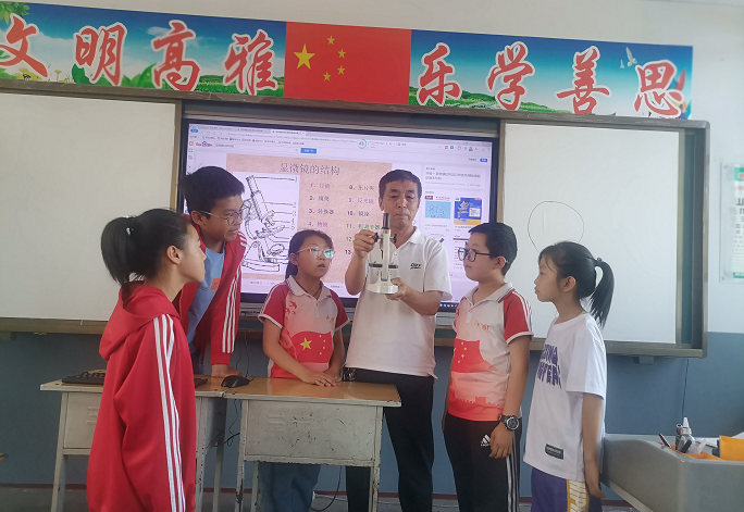 6月25日,吕梁市方山县峪口镇南村小学五年级学生在老师指导下学习显微镜的使用。南村小学注重对学生科学兴趣的培养,常识教研组对照课本知识,经常在实验室、课堂上指导孩子们做实验,书本知识和实践相结合的教学方式,提高了孩子们的学习兴趣,激发了学生学科学、爱科学的热情。