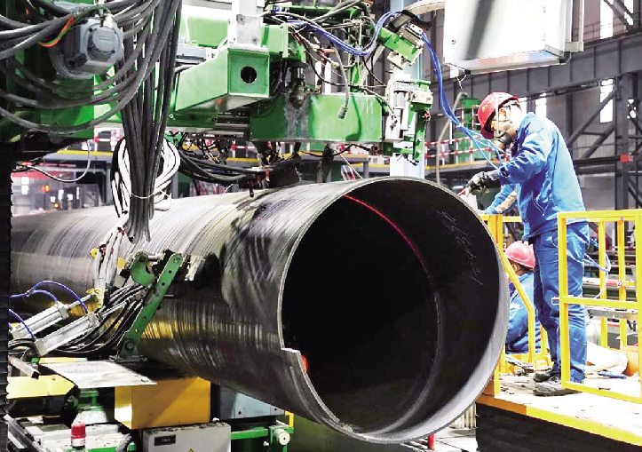 4月12日,工人在河北省秦皇岛经济技术开发区一家钢管企业的生产车间工作。