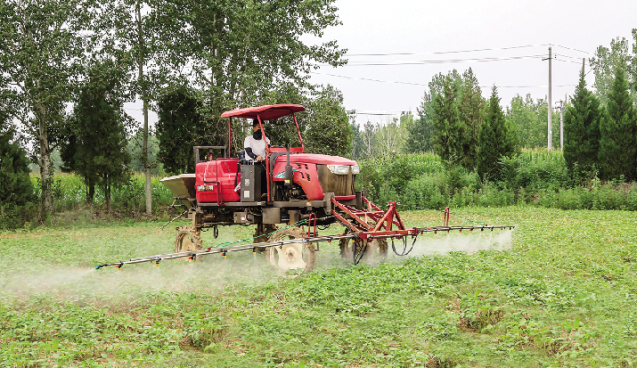 7月20日,在高平市河西镇官庄村大豆田里,一派夏管农忙景象。两台自走式喷雾机来回穿梭,将混配好的药剂均匀地喷施在大豆秧苗上,为其披上一层健康“外衣”。自走式喷雾机有一对长长的机翼,作业宽度最长可达十几米。时下,酷暑当头,喷雾机助力,不仅降低了农民朋友田间作业的强度和难度,且机翼上的雾化喷头雾化效果好、穿透性强,也大大提高了喷洒速度,为今秋大豆丰收奠定了基础。■科学导报记者杨凯飞摄